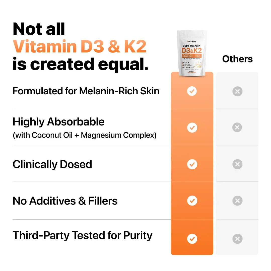 This formula has the perfect balance of Vitamin D3 and K2 to send calcium where it belongs — into your body, not your arteries. Since 80% of Black people are Vitamin D deficient, D3 boosts calcium absorption while K2 directs it to the right places for strength and health.